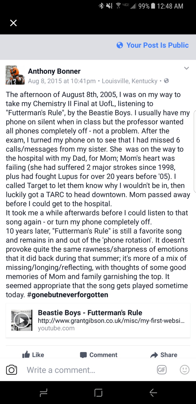 “Night Walks”: August 8th – Flashback Posted on August 9, 2017January 12, 2020 by Anthony B. This screenshot is from a Facebook post from 2015. (The exam was actually Physics II, not Chemistry II) The track in that post is another example of how music can take you to many different places, in many different ways. R.I.P. Mom! Share this: Click to share on X (Opens in new window) X Click to share on Facebook (Opens in new window) Facebook Like Loading...