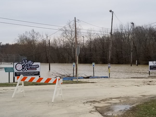 - As a real-time, current events story for the non-local readers: the Ohio River is in moderate flood stage. Meaning: big chunks of the West End, Downtown, the Harrods Creek area, and other parts of Louisville, as well as parts of Jeffersonville, Clarksville, New Albany, and Utica, IN are under water. Nearly 7 inches of rain over a 5-day period have caused the Downtown portion of the Ohio to rise from about 15 feet, past the 23-foot Flood Stage, to 36 feet (as of Sunday morning) … and it won’t crest until sometime on Monday. It’s the highest the river has been since 1997, a major flood for Louisville. It might be a week before we get the river back down to minor flood stage. (The Featured Image is from New Albany, IN, a city across the river from Louisville)