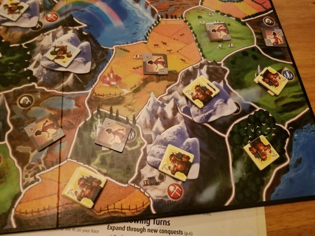 Using a combination of the races and powers, plus a number of tiles specified by your races and powers (see the numbers in the bottom-left corner? Add the 2 numbers together on the race and power tiles to get the number of tiles you get), you try to take over as many neighboring territories as possible. Once your holdings get too thin, then you put your race in “decline” – in general, they go inactive and you get to pick/buy another combination of race and powers.