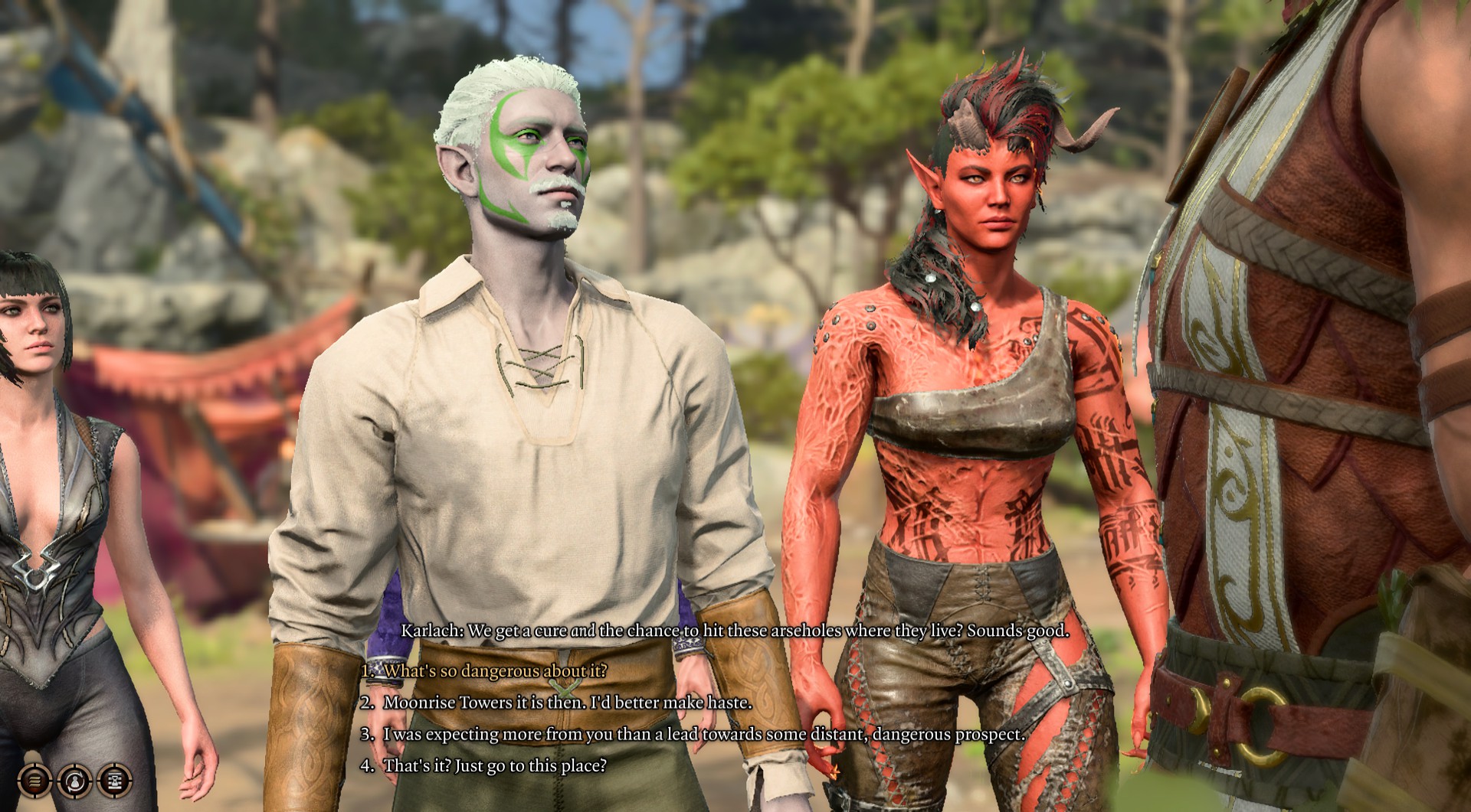 You can talk – or try to talk – to most humanoids in BG3, as well as animals(!). In the above screenshot, my character (center), Shadowheart (left), and Karlach (right), are talking to –WON’T SPOIL WHO THAT IS– at camp. Most conversations will give you at least 3 choices to pick; I’ve seen 10 in one conversation menu. Your Race, previous actions, and previous dialogue choices can and will affect subsequent choices. For example, people reacted to me (Half-Drow) differently than Shadowheart; Karlach (Tiefling) got a couple of interesting early reactions from a group of Druids, solely based on her Race.